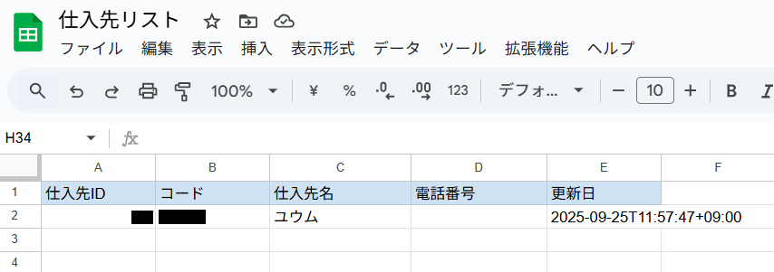 Google スプレッドシートにレコードが追加されていますのでご確認ください。 ※実際のフロー稼働時は、取得した仕入先の数分レコードが追加されます。