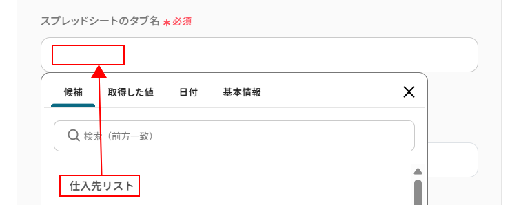 スプレッドシートのタブ名も同様に、入力欄をクリックして使用したいものを設定します。