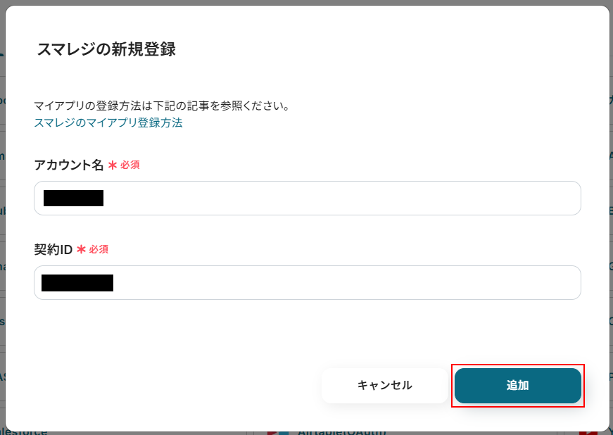 表示内容を確認し、アカウント名と契約IDを入力したら追加 をクリックします。