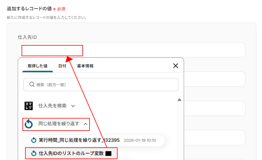 追加するレコードの値にはGoogle スプレッドシートに設定している項目名が表示されます。 それぞれに値を設定してください。 入力欄をクリックすると取得した値を設定できます。 取得した値を活用することで、固定値ではなく、トリガーが実行されるたびに最新の情報が反映できます。 ※取得した値を設定する場合は、以下のように同じ処理を繰り返すの項目にある○○のループ変数 となっているものを選択してください。
