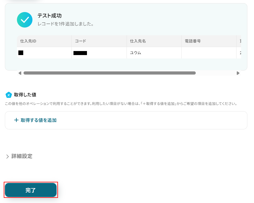 テストに成功するとテスト成功画面と取得した値が表示されますのでご確認ください。 確認できたら完了 をクリックしましょう。