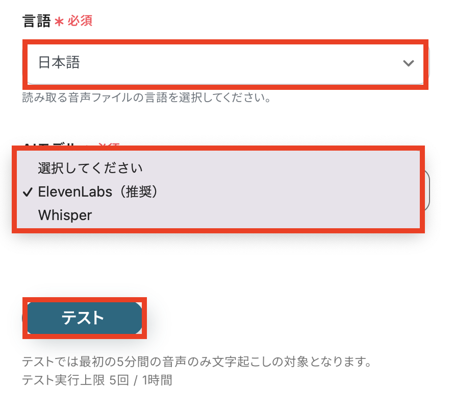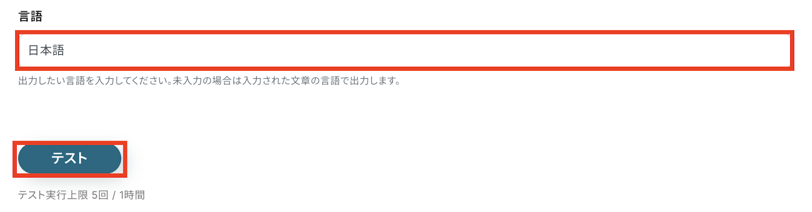 「言語」と「AIモデル」を選んだら「テスト」を押しましょう。