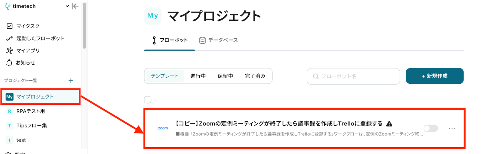 左側にあるメニューの「マイプロジェクト」から、コピーしたテンプレートを開きます。