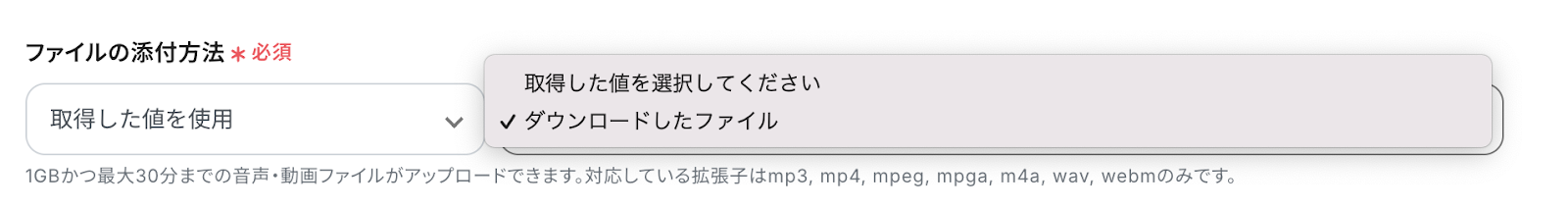 「ファイルの添付方法」は「取得した値を使用」と「ダウンロードしたファイル」を選びます。