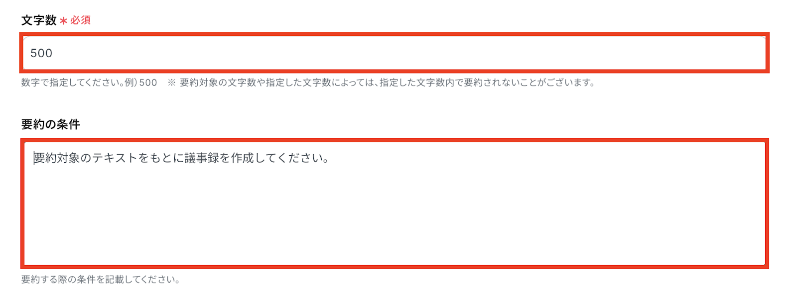 「文字数(何文字に要約するのか)」と「要約の条件」も入力します。