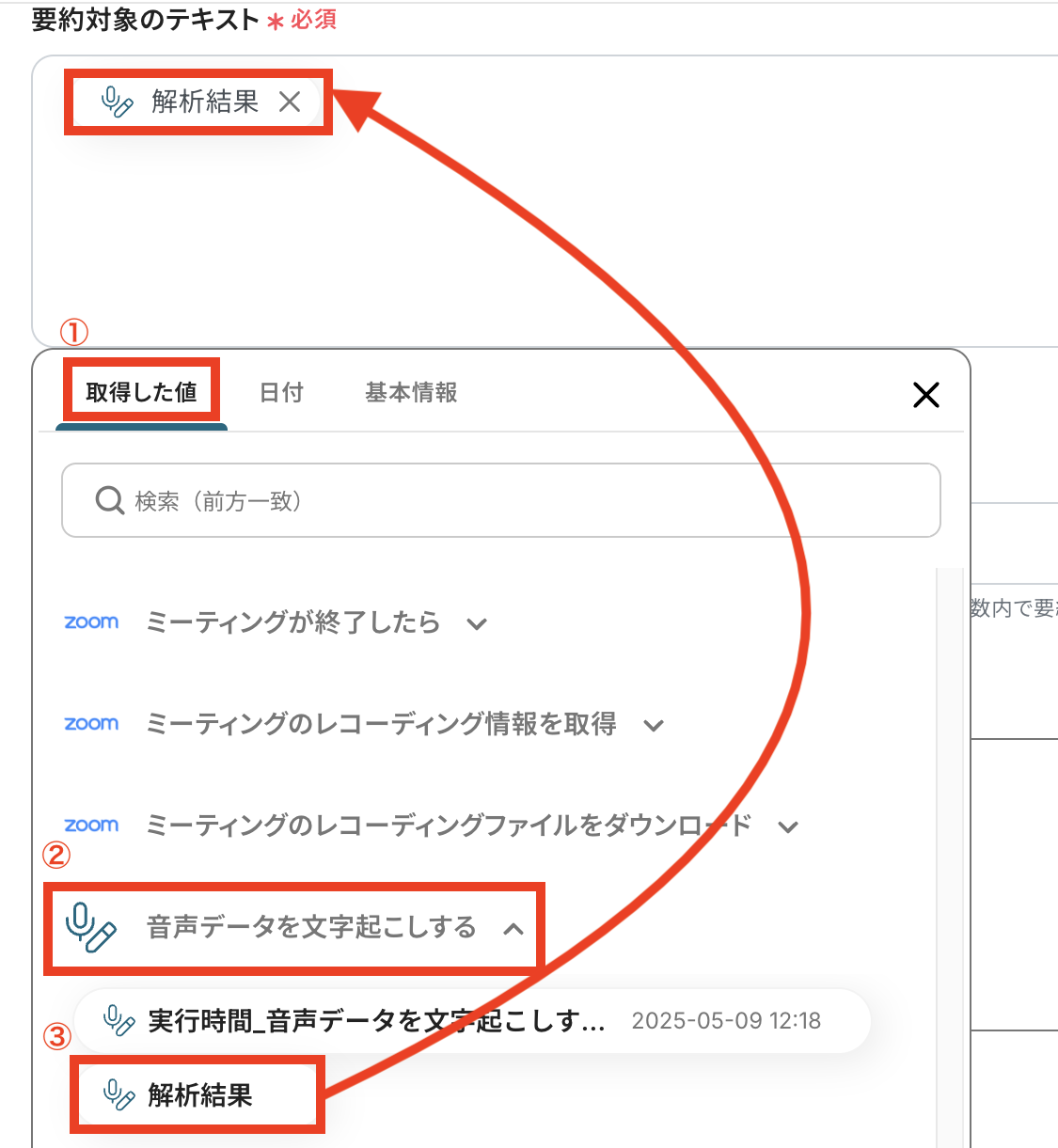 「要約対象のテキスト」をステップ6で取得した値を活用して入力します。