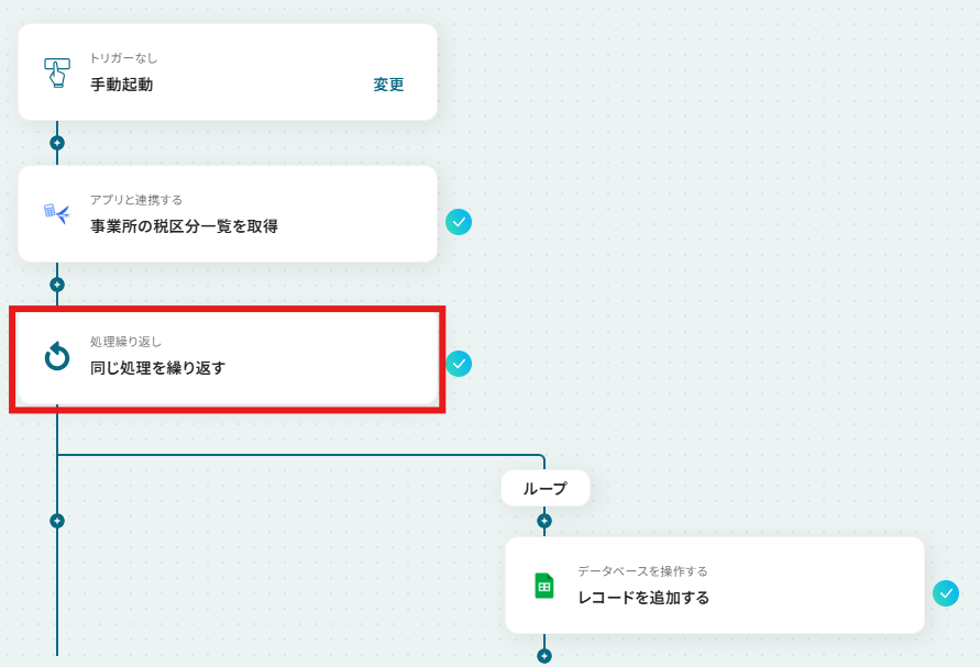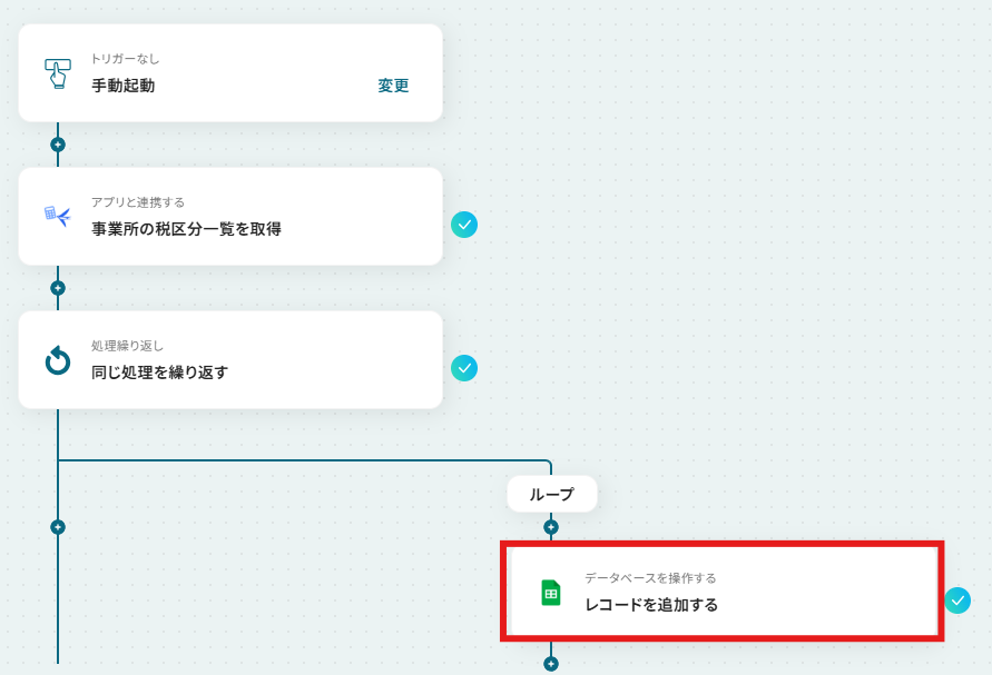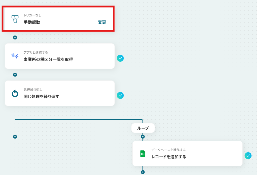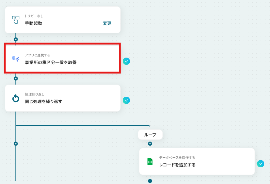 はじめに、freee会計とGoogle スプレッドシートをYoomと連携します 次に、トリガーで「手動起動」を選択し、任意のタイミングで実行できるように設定します 次に、オペレーションでfreee会計の「事業所の税区分一覧を取得する」アクションを設定します 続いて、オペレーションで繰り返し処理(ループ)機能を設定し、取得した税区分一覧のデータ1件ずつに対して処理を繰り返すようにします 最後に、オペレーションでGoogle スプレッドシートの「レコードを追加する」アクションを設定し、ループ処理で取り出した税区分情報を指定のシートに行として追加します ※「トリガー」:フロー起動のきっかけとなるアクション、「オペレーション」:トリガー起動後、フロー内で処理を行うアクション■このワークフローのカスタムポイント