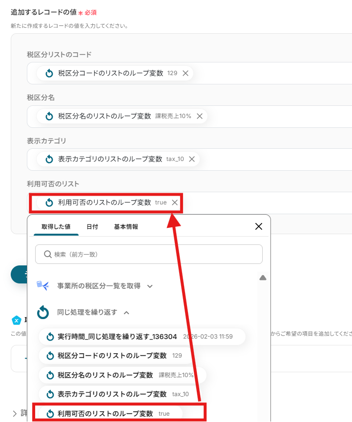 追加するレコードの値は、それぞれ以下のように取得した値からループ変数を入力してください。