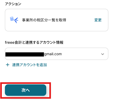 アクションはデフォルト設定のまま、アカウント情報は、連携したいアカウントが選択されているか確認してください。