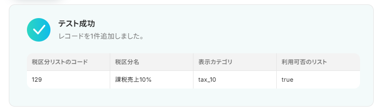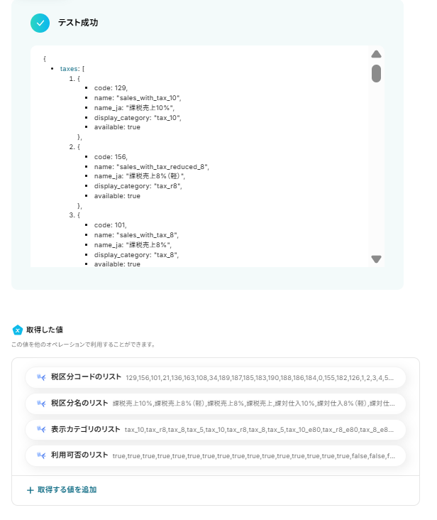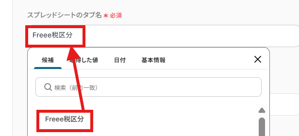 freee会計で税区分一覧を取得する際に、対象としたい事業所のIDを任意で設定してください ループ機能では、前段のfreee会計で取得した税区分一覧のデータのうち、繰り返し処理を行いたい項目を任意で設定します Google スプレッドシートにレコードを追加する際に、出力先となる任意のスプレッドシートIDやシート名(タブ名)を設定してください ■注意事項