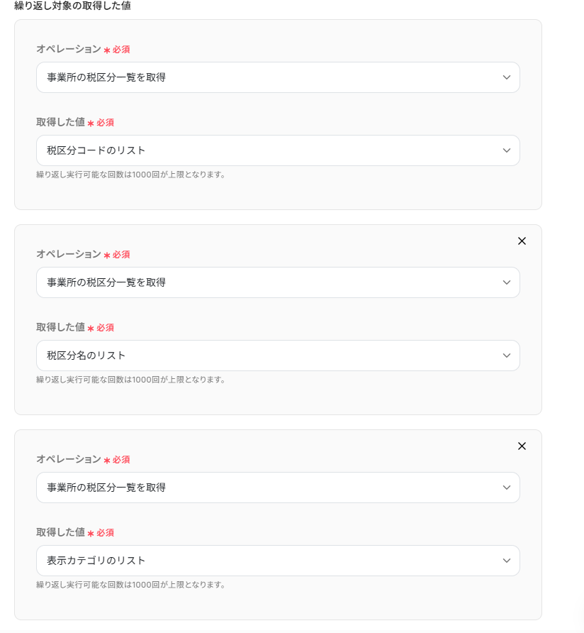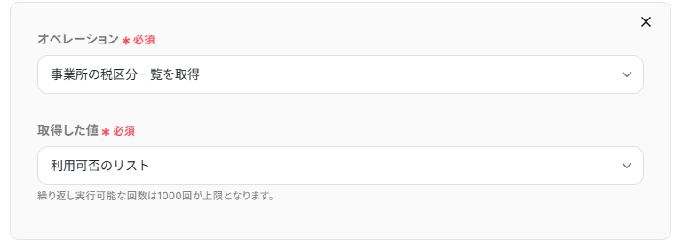 ※「同じ処理を繰り返す」オペレーションを使う場合は、チームプランまたはサクセスプランが必要です。フリープラン・ミニプランだと、設定してもエラーになってしまうのでご注意ください。