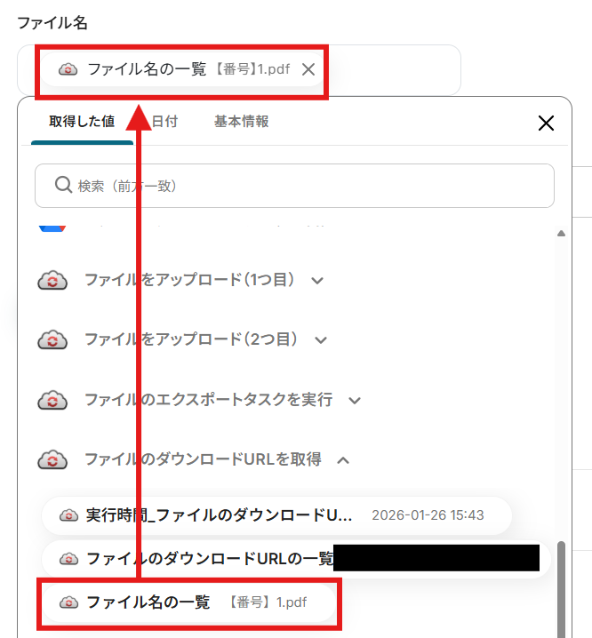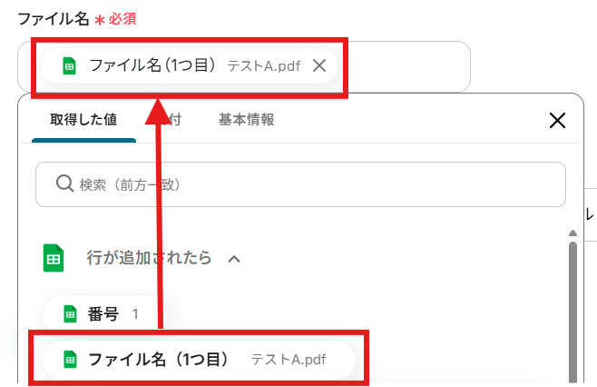 「ファイル名」を「取得した値」を用いて設定しましょう。1つ目のファイル名を使用しました!