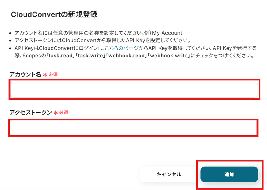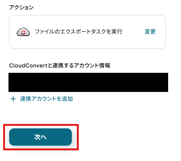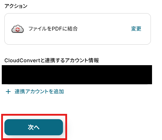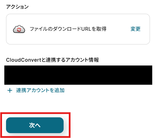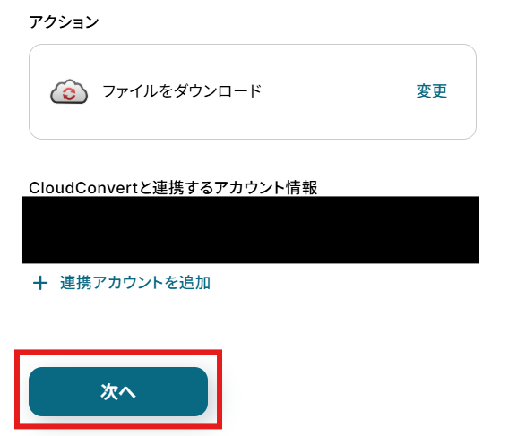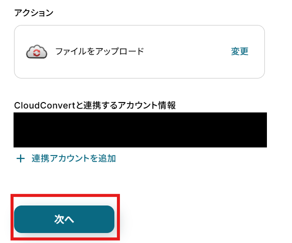 「CloudConvertと連携するアカウント情報」を確認し、「次へ」をクリックして進んでください。