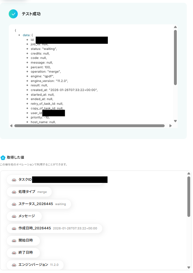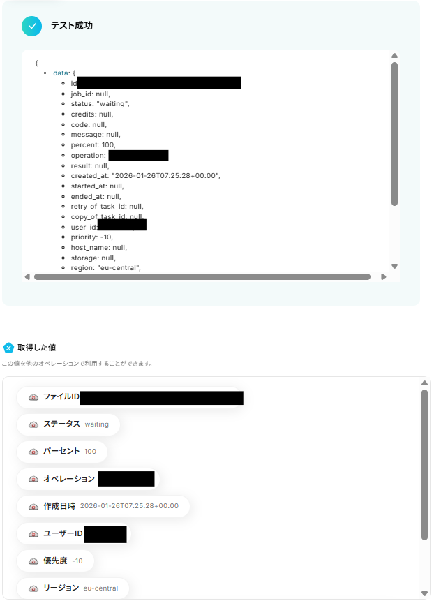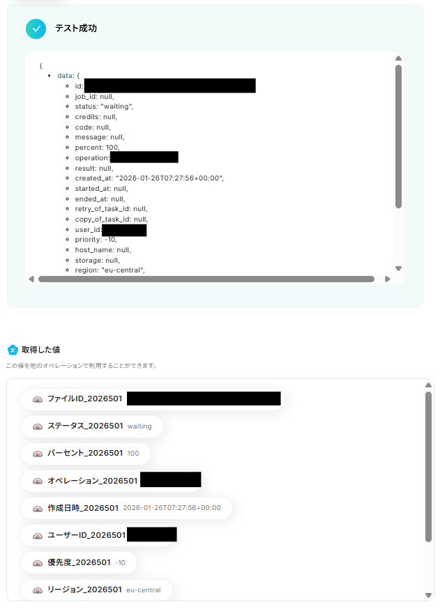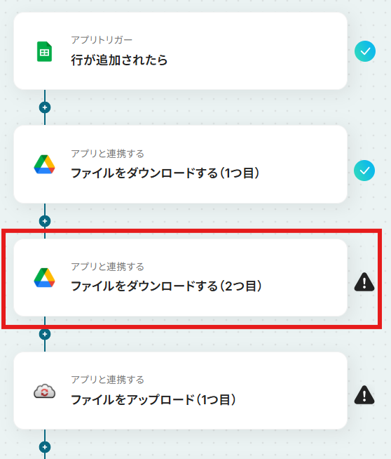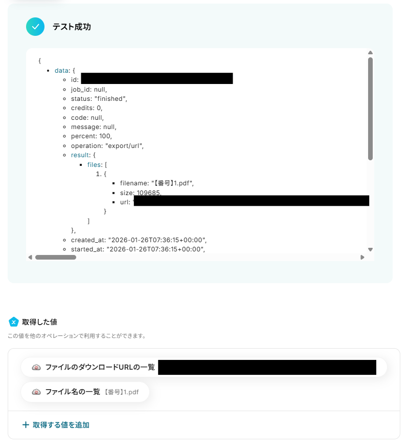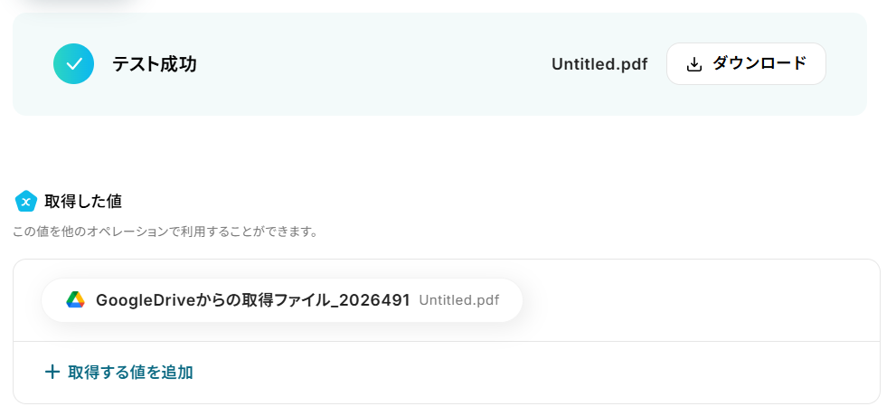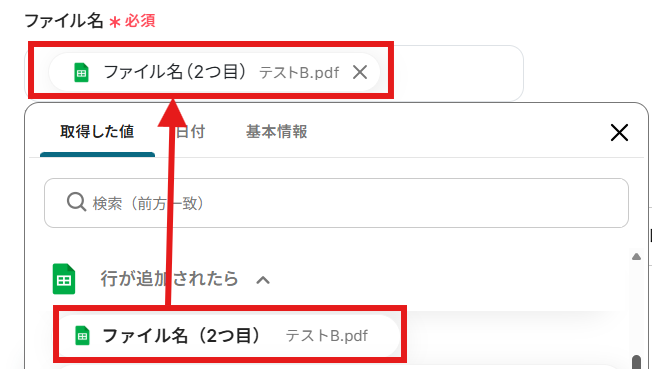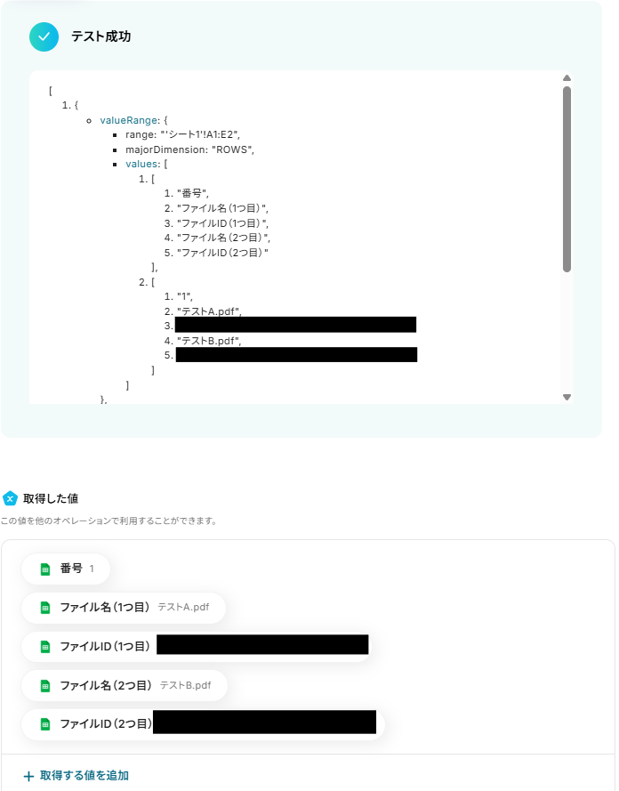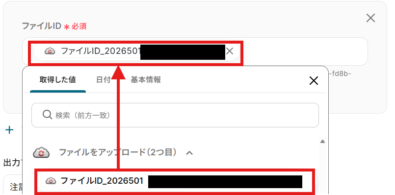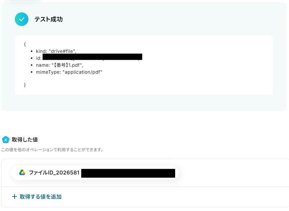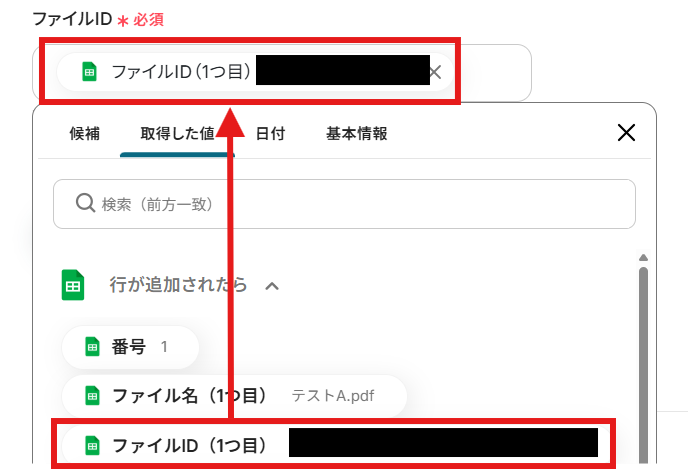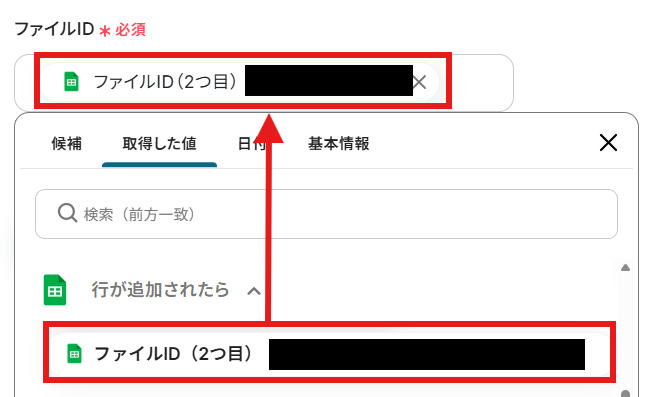 「ファイルID」を「取得した値」から設定しましょう。2つ目のファイルIDを設定しました!