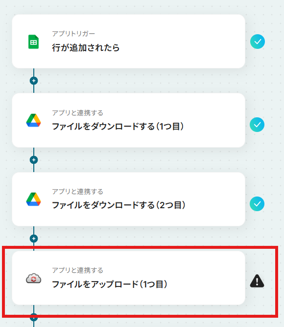 はじめに、Google スプレッドシート、Google Drive、CloudConvertをYoomと連携します。 次に、トリガーでGoogle スプレッドシートを選択し、「行が追加されたら」というアクションを設定し、結合したいファイルの情報を取得します。 続けてオペレーションで、トリガーで取得した情報をもとに、Google Driveから2つのファイルをそれぞれダウンロードするよう設定します。 次に、ダウンロードしたファイルをCloudConvertにそれぞれアップロードし、「ファイルをPDFに結合」アクションで1つのファイルにまとめます。 その後、CloudConvertで結合したファイルのダウンロードURLを取得し、ファイルをダウンロードします。 最後に、Google Driveの「ファイルをアップロードする」アクションを設定し、結合されたファイルを指定のフォルダに保存します。 ※「トリガー」:フロー起動のきっかけとなるアクション、「オペレーション」:トリガー起動後、フロー内で処理を行うアクション■このワークフローのカスタムポイント