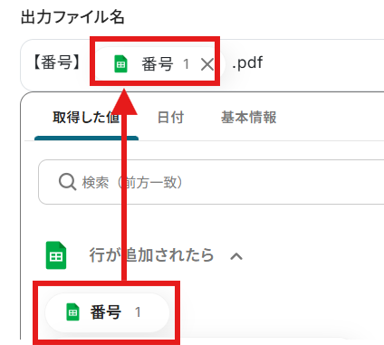 「出力ファイル名」を設定しましょう。 例として、固定のテキストと「取得した値」を用いて以下のように設定しました!
