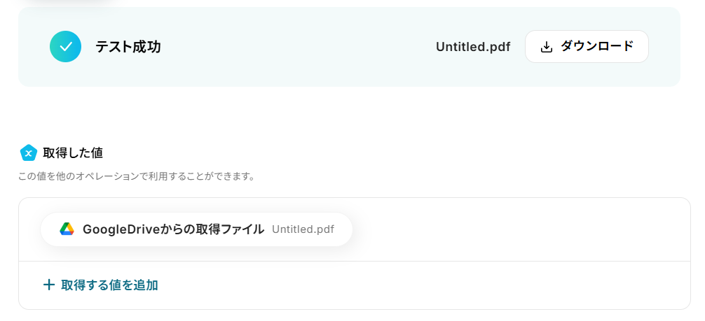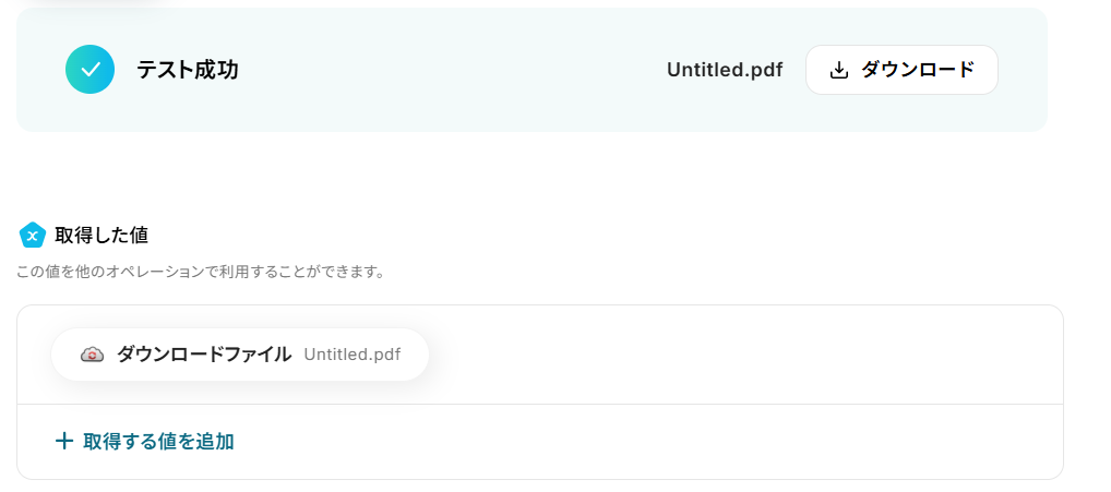 設定できたら「テスト」を行いましょう。 テストに成功すると、対象のファイルがダウンロードされます。 この時、ダウンロードされたファイルの名前は「Untitled」で固定されるため、正しいファイルであるかを確認する場合は「ダウンロード」をお試しください。 「完了」を選択しましょう。