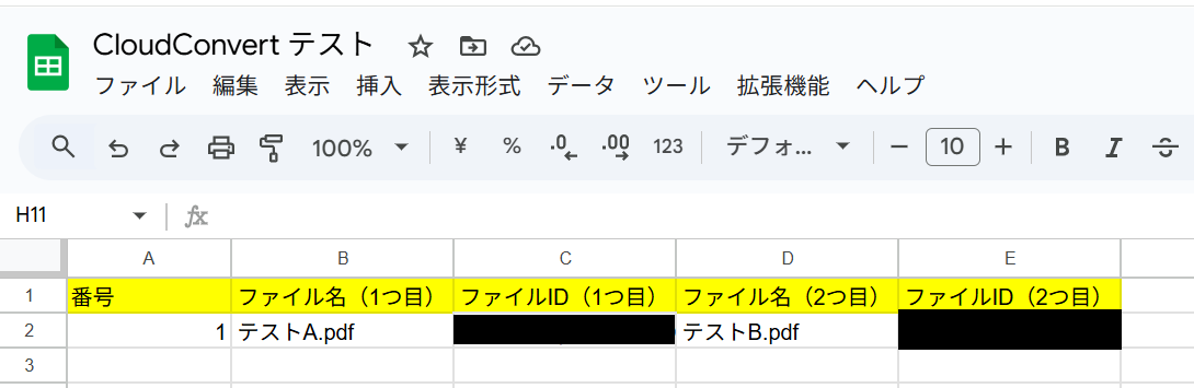 今回のフローで使用したいGoogle スプレッドシートの準備がまだの方は作成しましょう。 一意の値(今回の例では「番号」)・ファイル名・ファイルIDは今回のフローで必ず使用するので、必須です。