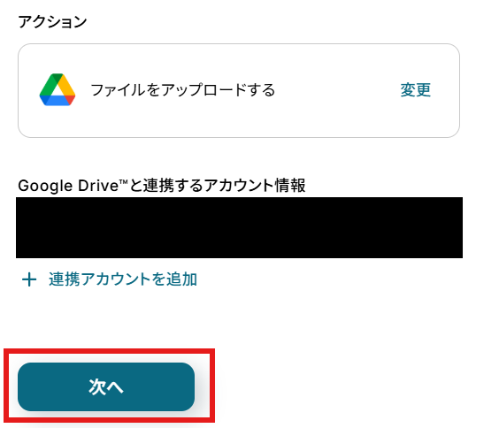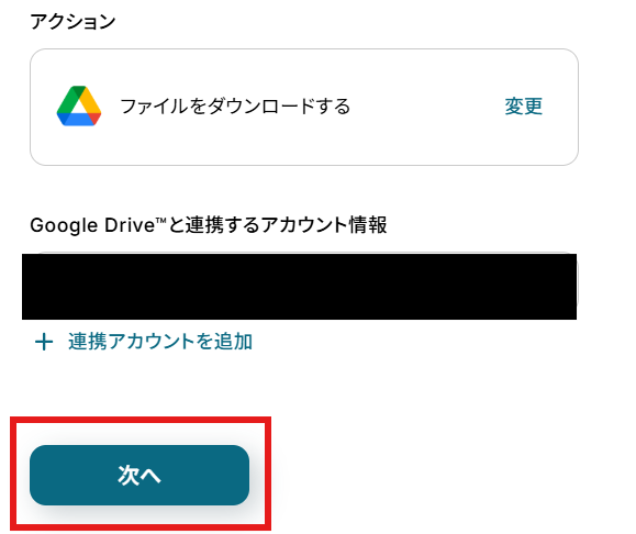 「アクション」はテンプレート通りのままでOKです! 「Google Driveと連携するアカウント情報」を確認し、「次へ」をクリックして進んでください。