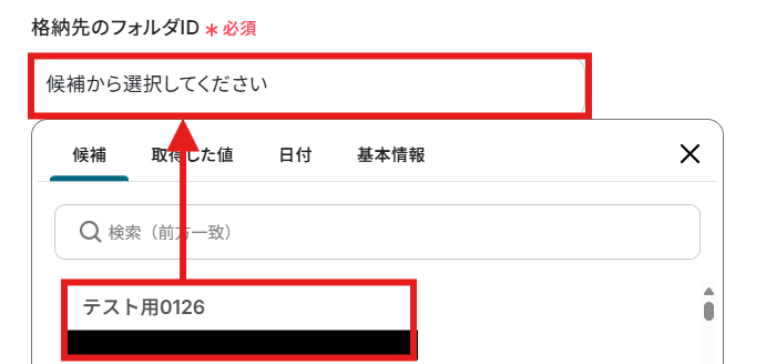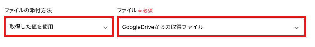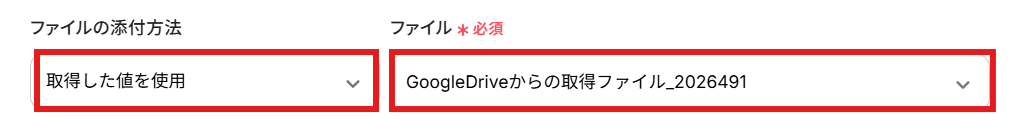 「ファイルID」を「取得した値」から設定しましょう。1つ目のファイルIDを設定しました! 取得した値は変数となります。固定値ではないため、トリガーが実行されるたびに取得した情報を反映できます。