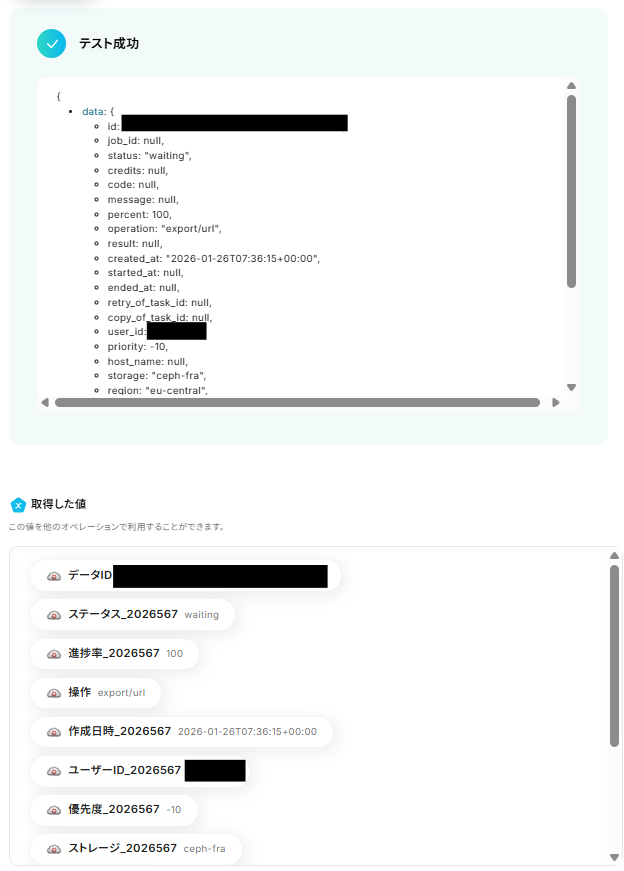 設定できたら「テスト」を行いましょう。 テストに成功すると「取得した値」に反映されます。