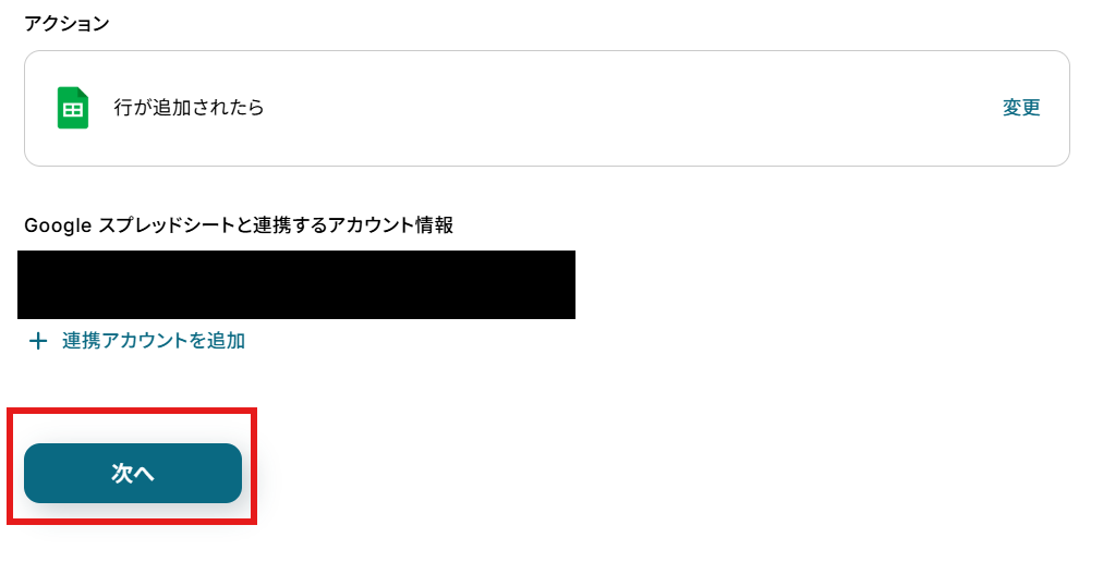 「アクション」はテンプレート通りのままでOKです! 「Google スプレッドシートと連携するアカウント情報」を確認し、「次へ」をクリックして進んでください。