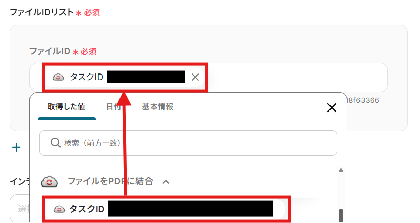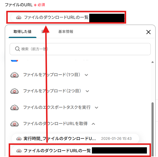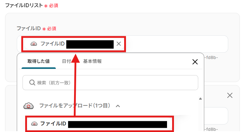 「ファイルIDリスト」を設定します。 「ファイルID」を「取得した値」から設定しましょう。