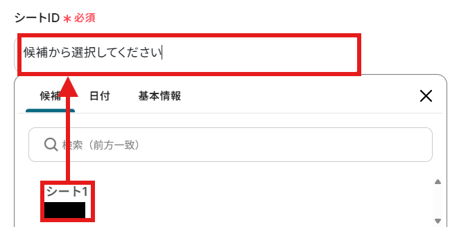 使用したいGoogle スプレッドシートの準備ができたらYoomの画面に戻りましょう。 作成したGoogle スプレッドシートの「スプレッドシートID」と「シートID」を候補から選択します。