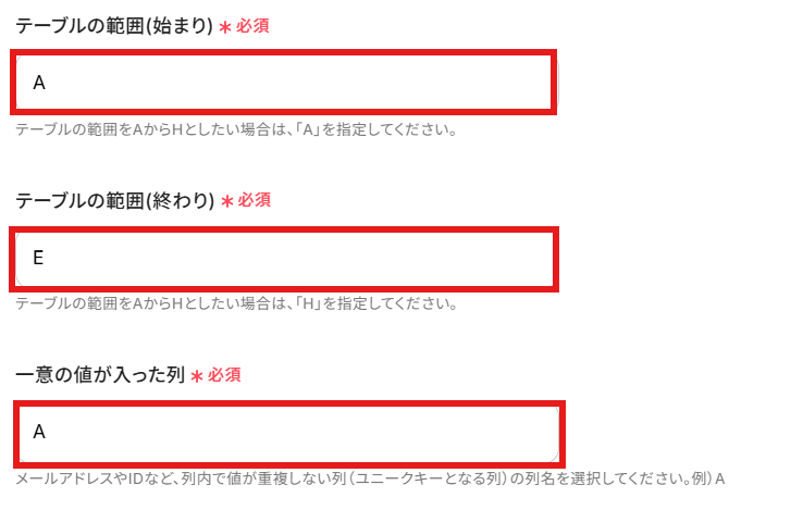 「テーブルの範囲(始まり)」「テーブルの範囲(終わり)」「一意の値が入った列」を注釈に沿って、手動で入力しましょう。