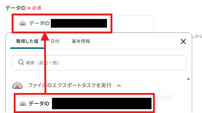 「ファイルをエクスポート」アクションで取得した「データID」を設定しましょう。