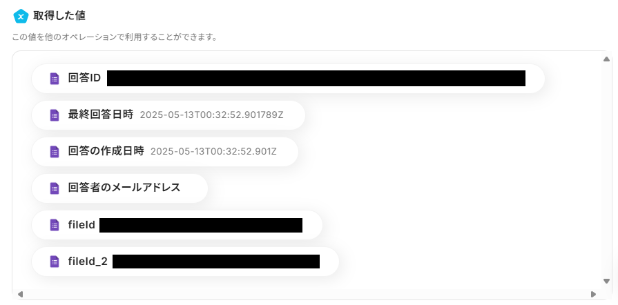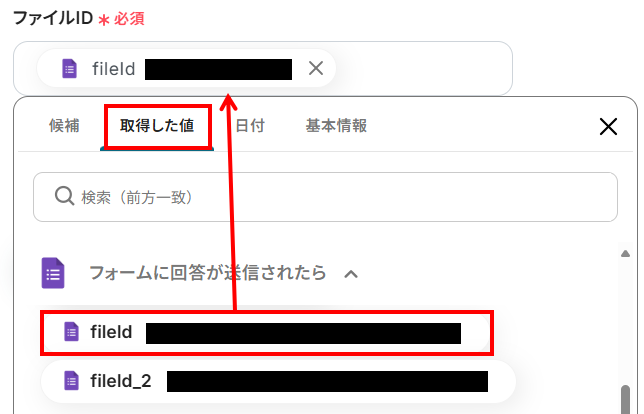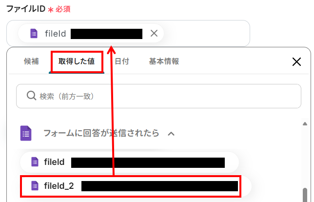 入力欄をクリックすると、下記のようなアウトプットが表示されるので、「取得した値」タブを選択し、Google フォームのファイルIDを1つ選択してください。