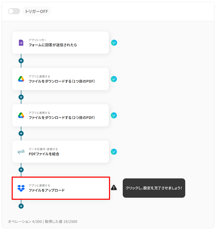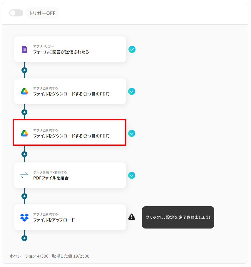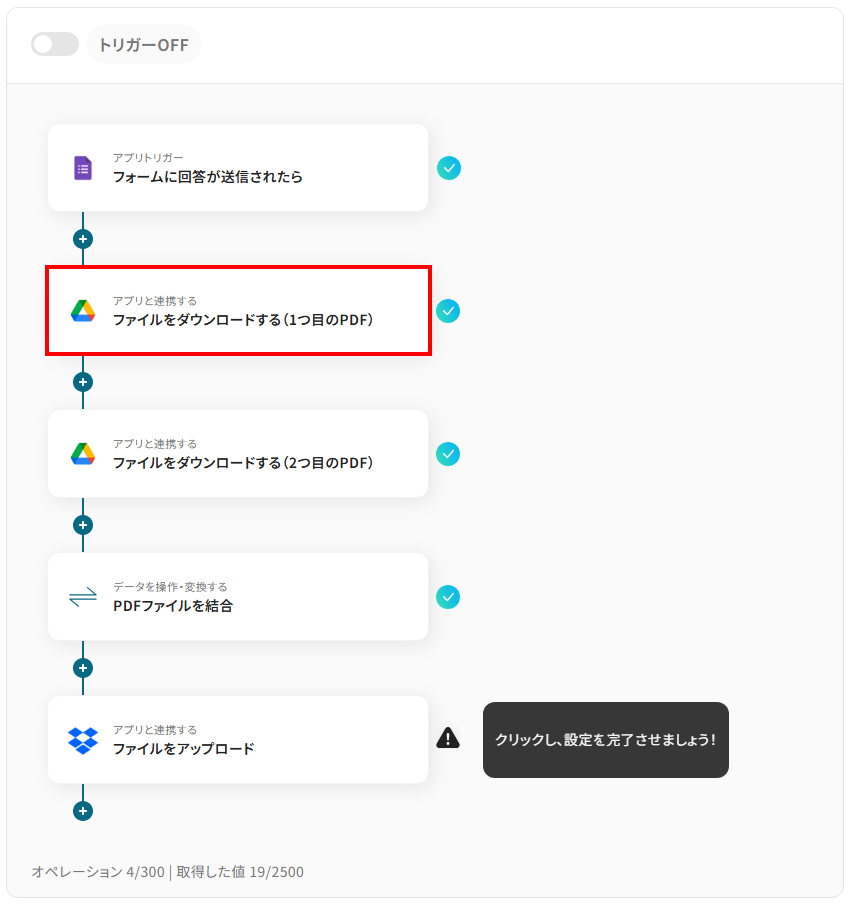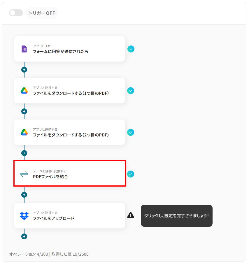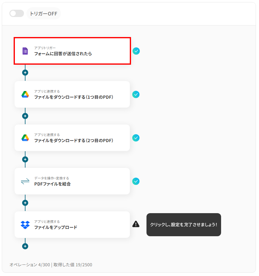 それではここから代表的な例として、Googleフォームでファイルがアップロードされた際に、複数のPDFファイルを自動で結合し、Dropboxに保存するフローを解説していきます!