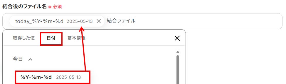 - 結合後のファイル名:お好きなファイル名を入力しましょう。入力欄をクリックすると、アウトプットが表示されますので、こちらを活用することも可能です。
