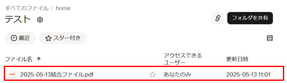 テストが成功すると、下記赤枠のようにDropboxの指定したフォルダに結合ファイルが保存されているはずです!