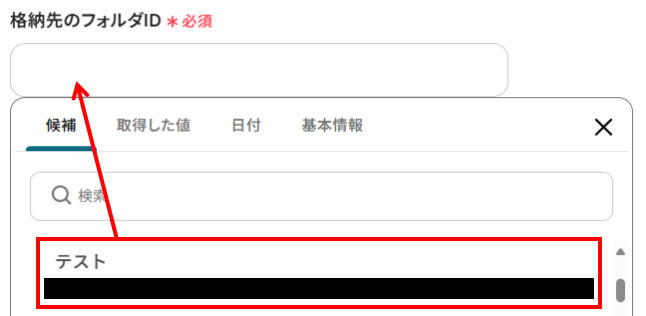 - 格納先のフォルダID:入力欄をクリックすると、候補が表示されます。アップロードしたいGoogle Driveのフォルダを選択してください。