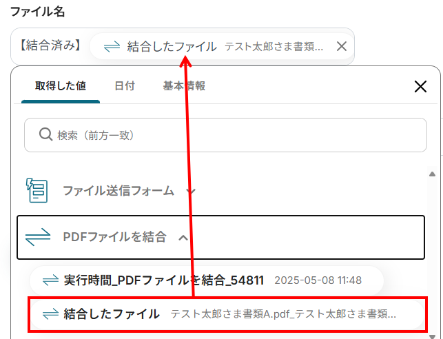 - 結合後のファイル名:入力欄をクリックすると、下記のようなアウトプットが表示されます。アウトプットを活用して、ファイル名を設定してください。