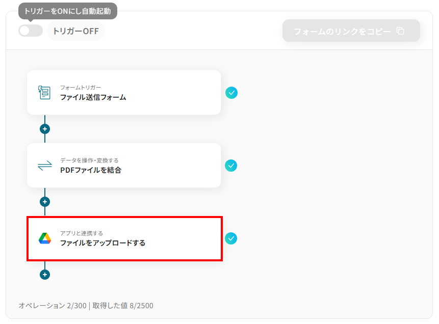 - フォームトリガーの設定、PDF結合設定、Google Driveのアクション設定