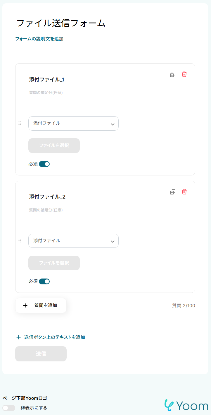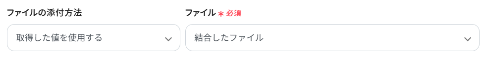 - ファイルの添付方法、ファイル:前のステップで結合したファイルがデフォルトで設定されているので、そのままで大丈夫です。