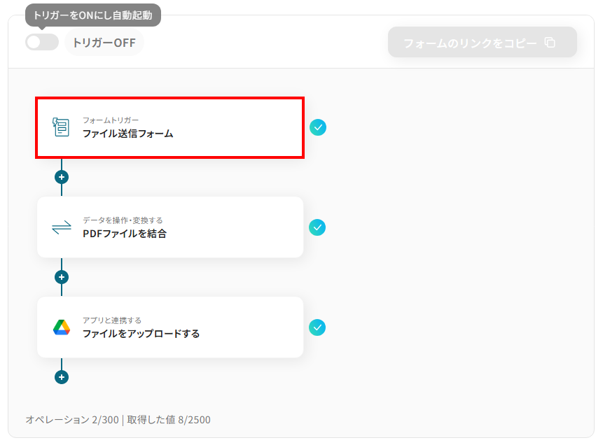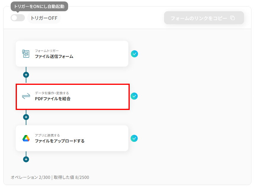 それではここから代表的な例として、フォームで受け取った複数のPDFファイルを自動で結合し、Google Driveなどのストレージサービスに格納するフローを解説していきます!このフローを使えば、手作業でのファイル収集や結合、アップロードといった一連の作業を自動化できるので、業務効率が格段に向上します。