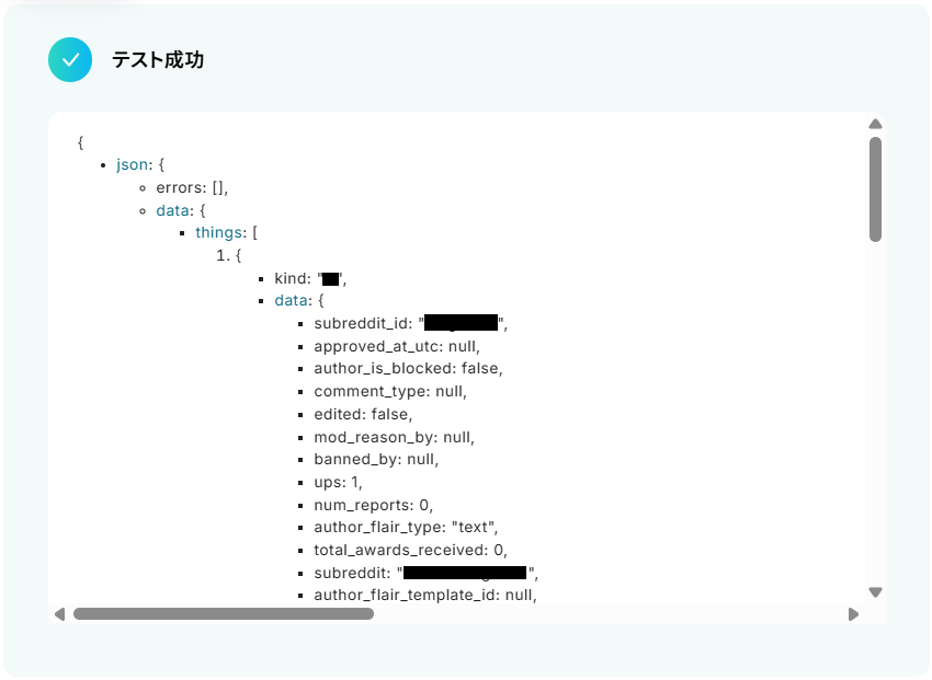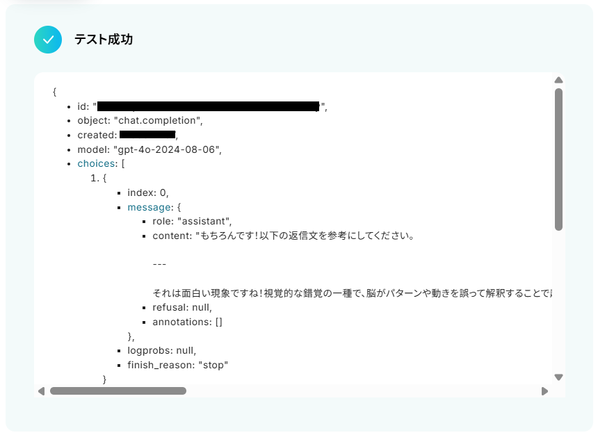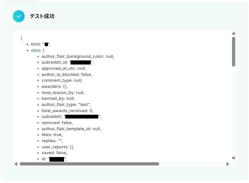 テストに成功するとテスト成功画面が表示され、取得した値が表示されます。 取得した値は実行した結果が設定される動的な値として利用できるため、このあとの設定でも使用します。 詳しく知りたい方は以下のリンク先をご覧ください。