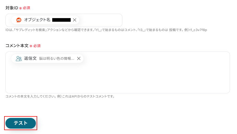 対象ID、コメント本文にはデフォルトで取得した値が設定されています。 項目名だけではなく、実際の値が表示されているのを確認してください。 内容を確認し、問題なければテスト をクリックしましょう。 ※テストをクリックすると、実際にコメントが投稿されます。