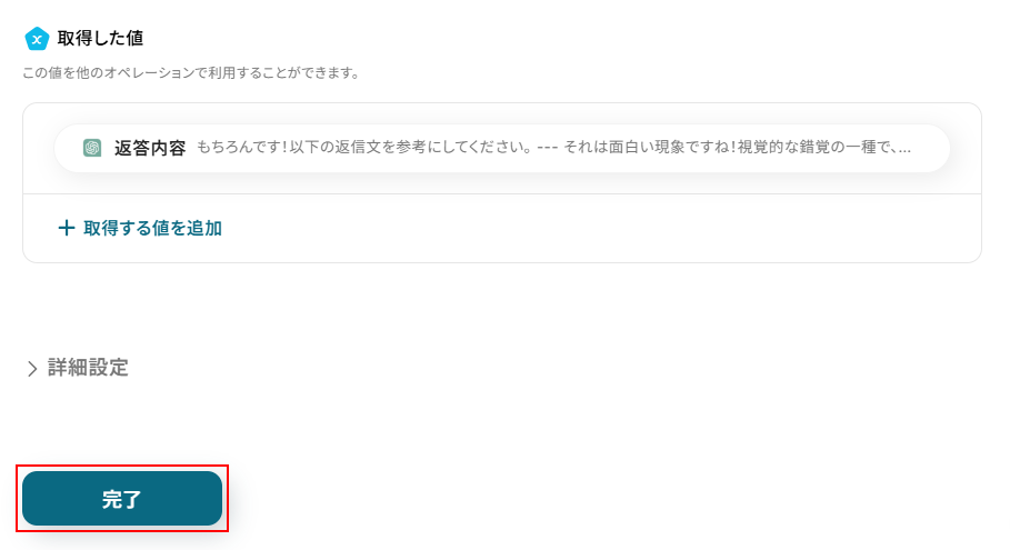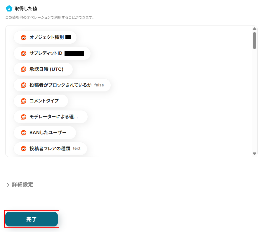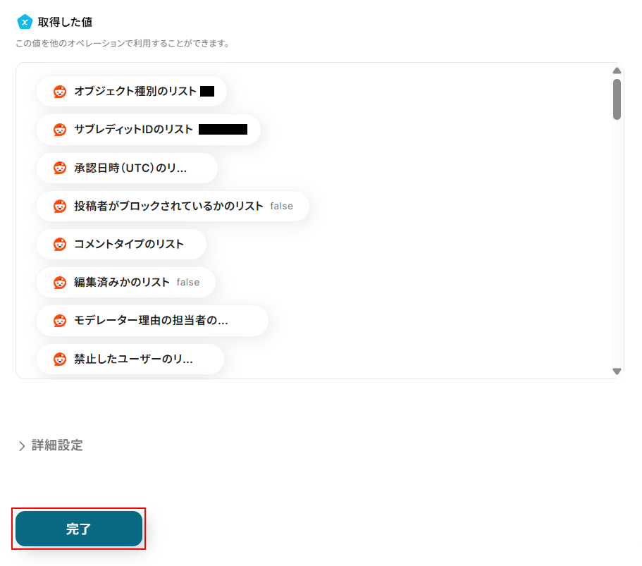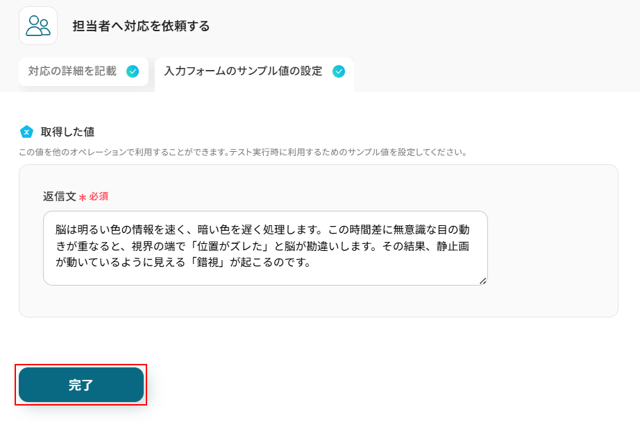 このページでは、実際に担当者が先ほど設定した入力フォームに入力し、それを受け取ったという想定で、取得した値に仮の値を設定できます。 今回ご紹介するテンプレートでは、対応を依頼する内容の詳細項目を確認した担当者 が、入力フォームの返信文にRedditに返信するコメントを直接入力する 想定で進みます。 そのため、今回は以下のような内容を入力しました。 設定できたら完了 をクリックしましょう。