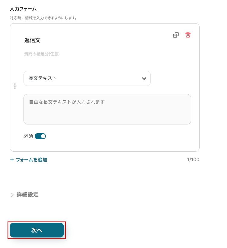 入力フォームにはデフォルトで返信文が設定されています。 他にも担当者に設定してもらいたい項目がある場合は、+フォームを追加をクリックして設定を行ってください。