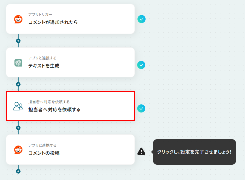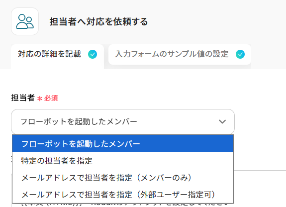 ステップ5:担当者へ対応を依頼する設定 担当者へ対応を依頼するアクションでは、先ほど生成したテキストの内容を設定した担当者に確認してもらいます。 担当者へ対応を依頼する をクリックしましょう。 設定方法についてより詳しく知りたい方は以下のリンク先をご確認ください。