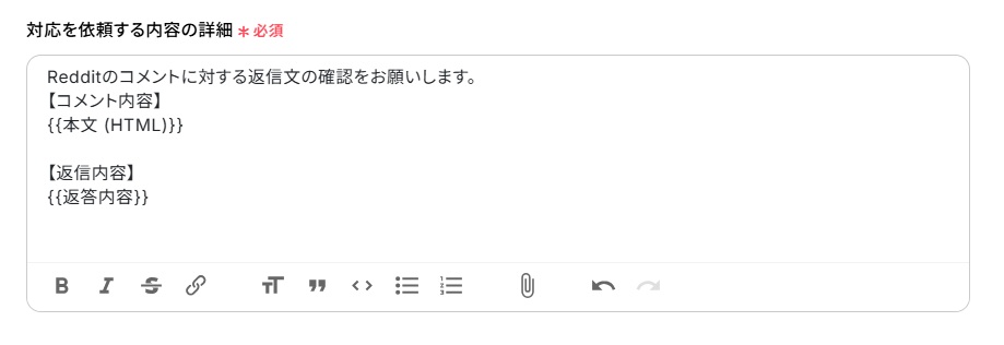 対応を依頼する内容の詳細はデフォルトで設定されていますが、自由に編集できます。 また、取得した値も設定可能です。 ご自身の状況に合わせて設定してください。 ※取得した値は{{○○}}と表示されます。 ※直接記入している箇所は固定文となりますのでご注意ください。