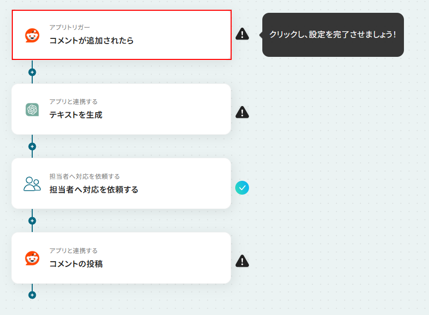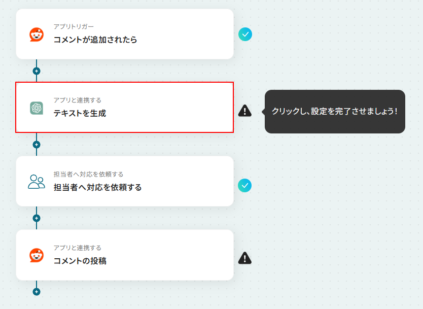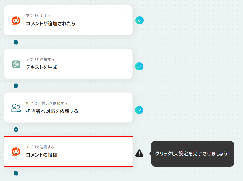 はじめに、ChatGPTとRedditをYoomと連携します 次に、トリガーでRedditを選択し、「コメントが追加されたら」というアクションを設定します 次に、オペレーションでChatGPTを選択し、「テキストを生成」アクションで追加されたコメントに対する返信案を作成します 次に、オペレーションで担当者依頼機能を選択し、「担当者へ対応を依頼する」アクションで、生成された返信案の確認を依頼します 最後に、オペレーションでRedditを選択し、「コメントの投稿」アクションで承認された内容を投稿します ※「トリガー」:フロー起動のきっかけとなるアクション、「オペレーション」:トリガー起動後、フロー内で処理を行うアクション■このワークフローのカスタムポイント
