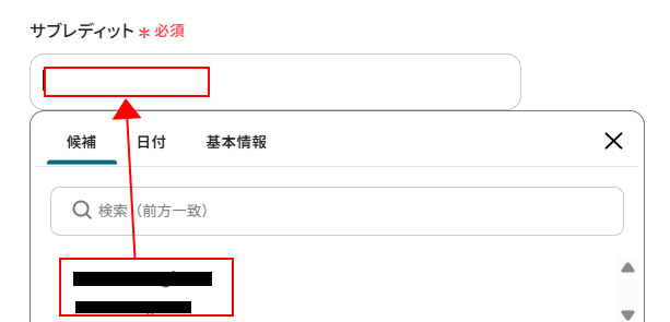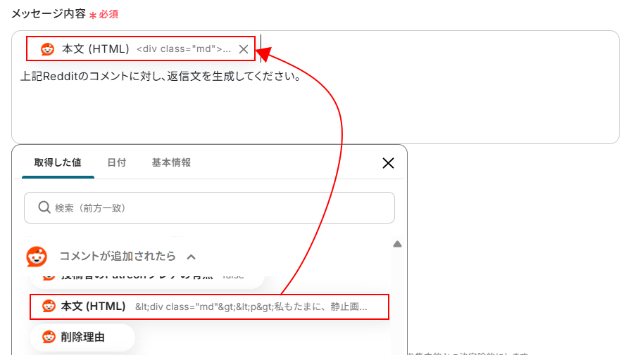 メッセージ内容(プロンプト)はデフォルトで設定されていますが、自由に編集可能です。 また、以下のように、メッセージ内容には取得した値を設定できます。 項目名だけではなく、実際の値が表示されているのを確認してください。 取得した値を活用することで、固定値ではなく、トリガーが実行されるたびに最新の情報が反映できます。 また、取得した値は以下のように入力欄をクリックすることで設定できます。 ※直接記入している箇所は固定文となりますのでご注意ください。