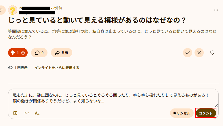 ここまで設定できたら、Redditの画面に移動し、先ほどサブレディットと投稿IDに設定した投稿へコメントを送りましょう。 今回ご紹介するテンプレートはRedditにコメントが追加されたら起動します。 そのため、実際にテストを行うにはコメントを行う必要があります。 今回は以下の投稿にコメントを行いました。