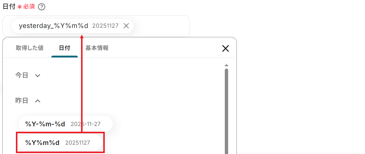 配信数を取得する日付を設定しましょう。 日付の変数を設定することで、トリガーが実行されるたびに最新の日付を反映できます。 ※「20220131」という形式で記載してください。 設定が完了したらテストしましょう。