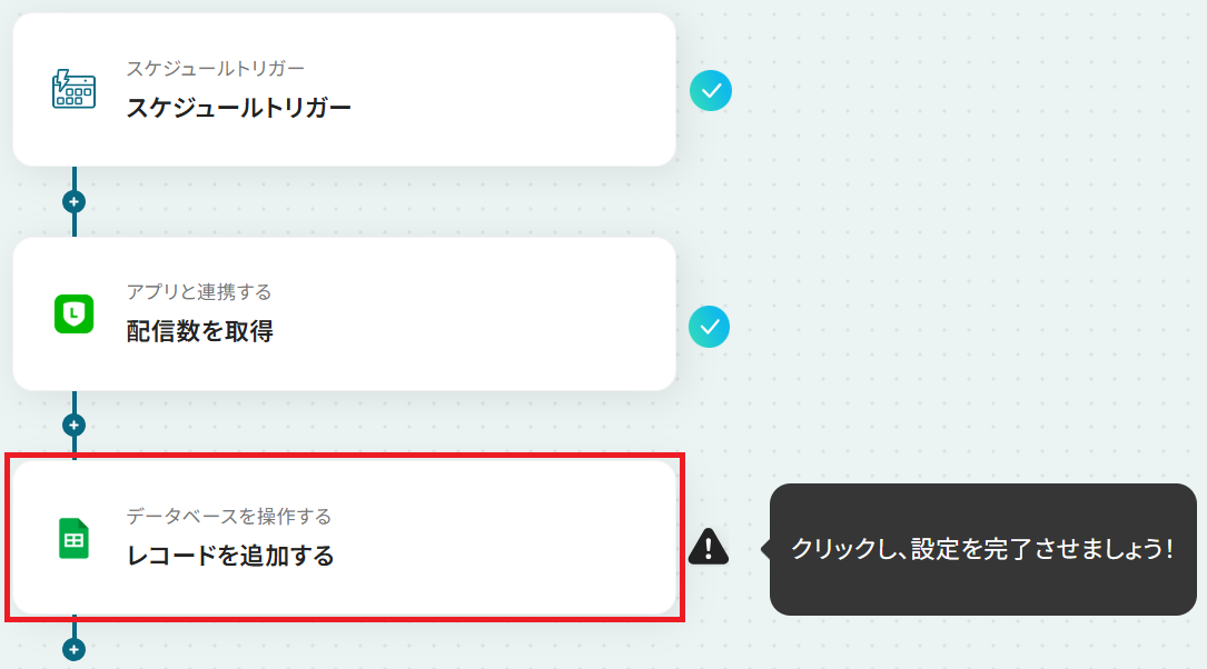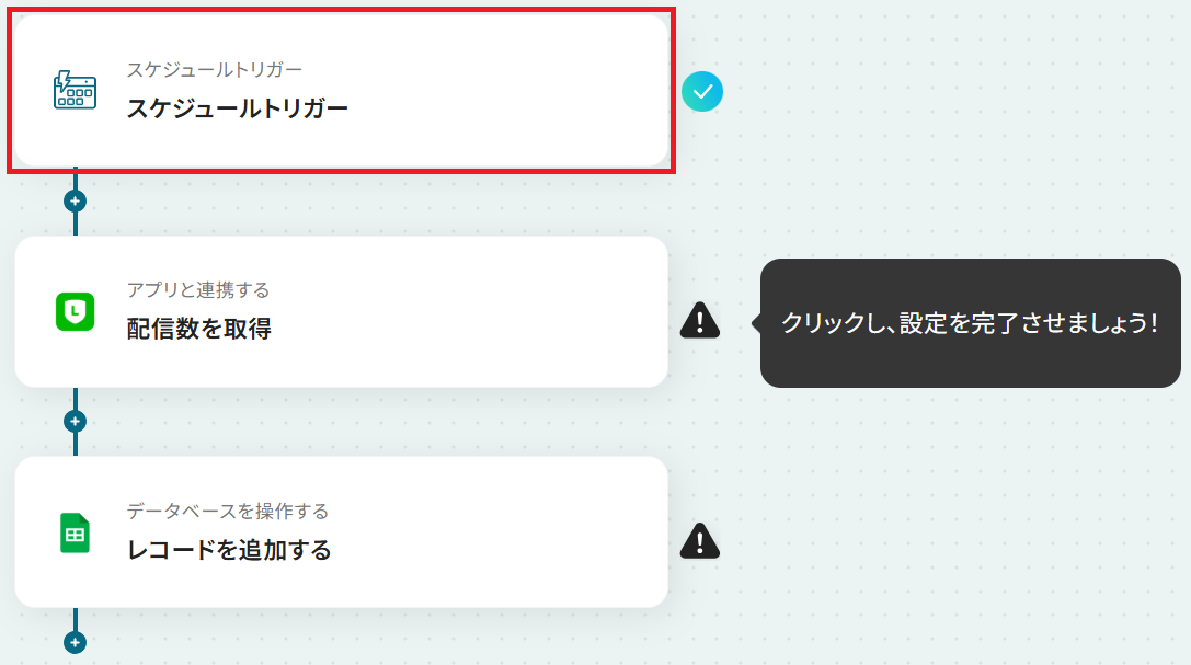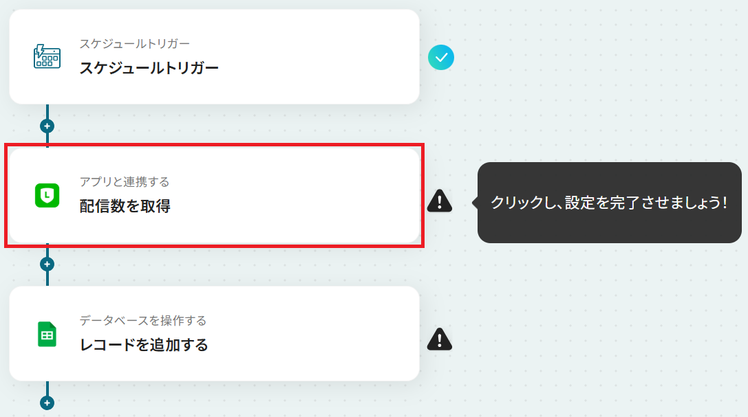 はじめに、LINE公式アカウントとGoogle スプレッドシートをYoomと連携します。 次に、トリガーで「スケジュール起動」を選択し、配信数を取得したいタイミングで起動するようスケジュールを設定します。 オペレーションでLINE公式アカウントを選択し、「配信数を取得」するアクションを設定します。 最後に、オペレーションでGoogle スプレッドシートの「レコードを追加する」アクションを設定し、取得した配信数データを指定のシートに記録します。 ※「トリガー」:フロー起動のきっかけとなるアクション、「オペレーション」:トリガー起動後、フロー内で処理を行うアクション■このワークフローのカスタムポイント